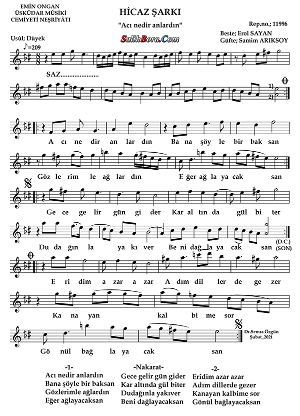 Bestesi Erol Sayan'a, güftesi Samim Arıksoy'a âit olan, hicâz makâmı, düyek usûlündeki şarkının; ayrıntılı bilgileri, sözleri, notaları ve video yorumları.
