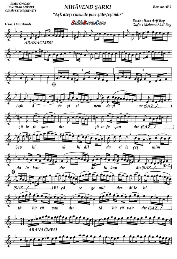 Bestesi Hacı Ârif Bey'e, güftesi Mehmet Sâdi Bey'e âit olan, nihâvend makâmı, devr-i hîndî usûlündeki şarkının; ayrıntılı bilgileri, sözleri, notaları ve video yorumları.