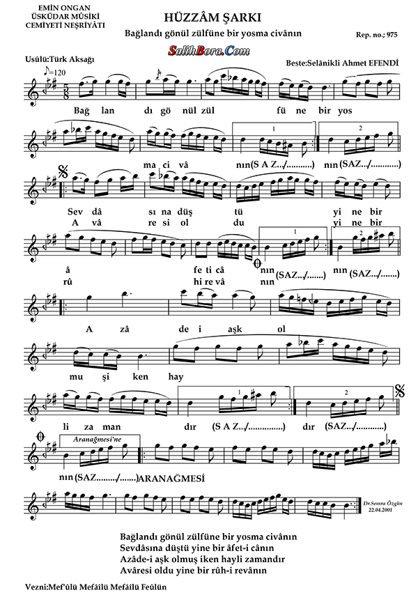 Bestesi Selânikli Ahmet Bey'e âit olan, hüzzâm makâmı, türk aksağı usûlündeki şarkının; ayrıntılı bilgileri, sözleri, notaları ve video yorumları.