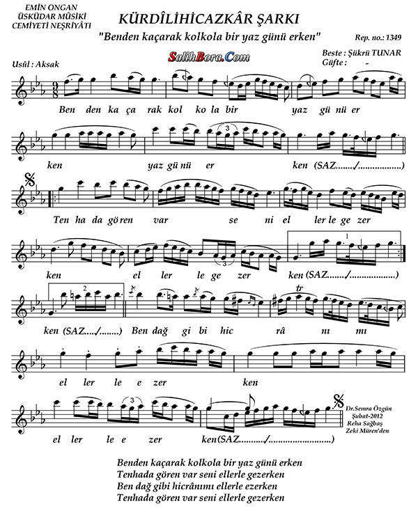 Bestesi Şükrü Tunar'a âit olan, kürdîli hicazkâr makâmı, aksak usûlündeki şarkının; ayrıntılı bilgileri, sözleri, notaları ve video yorumları.