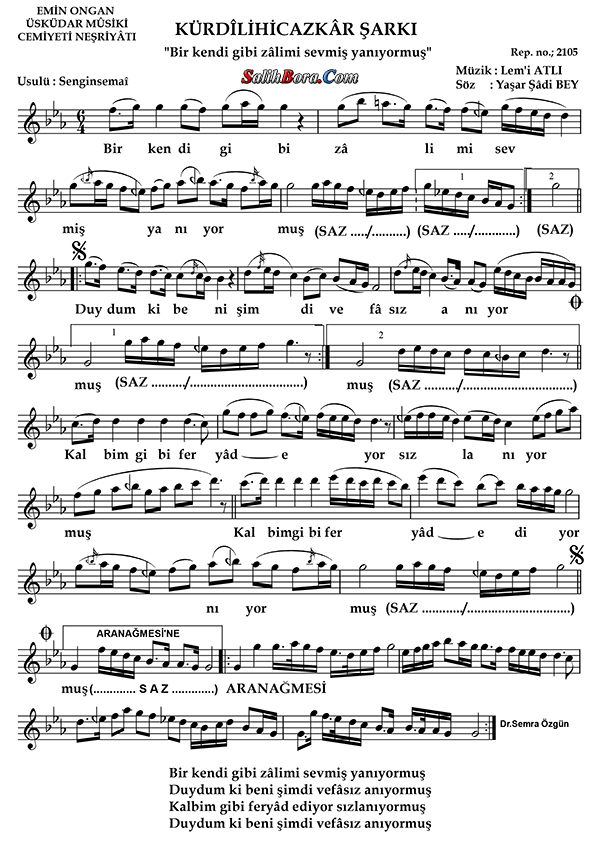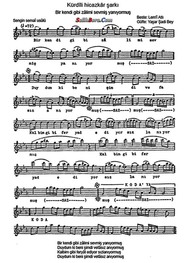 Bestesi Lemî Atlı'ya, güftesi Yaşar Şâdi Bey'e âit olan, kürdîli hicazkâr makâmı, sengin semâî usûlündeki şarkının; bütün bilgileri, sözleri, notaları ve video yorumları.