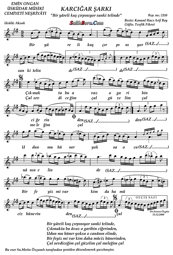 Bir yâreli kuş çırpınıyor sanki telinde - Kanûnî Hacı Ârif Bey