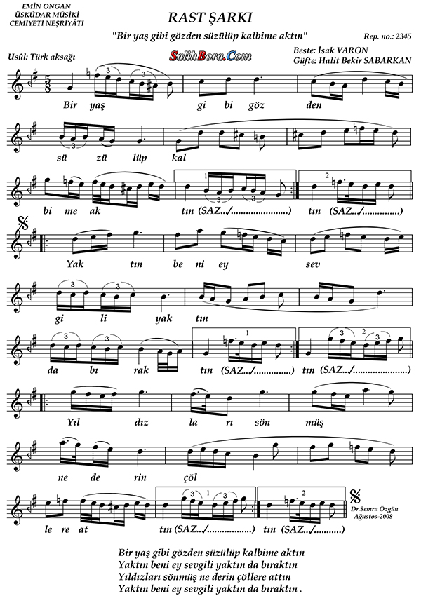 Bestesi İsak Varon'a, güftesi Halit Bekir Sabarkan'a âit olan, rast makâmı, türk aksağı usûlündeki şarkının; ayrıntılı bilgileri, sözleri, notaları ve video yorumları.