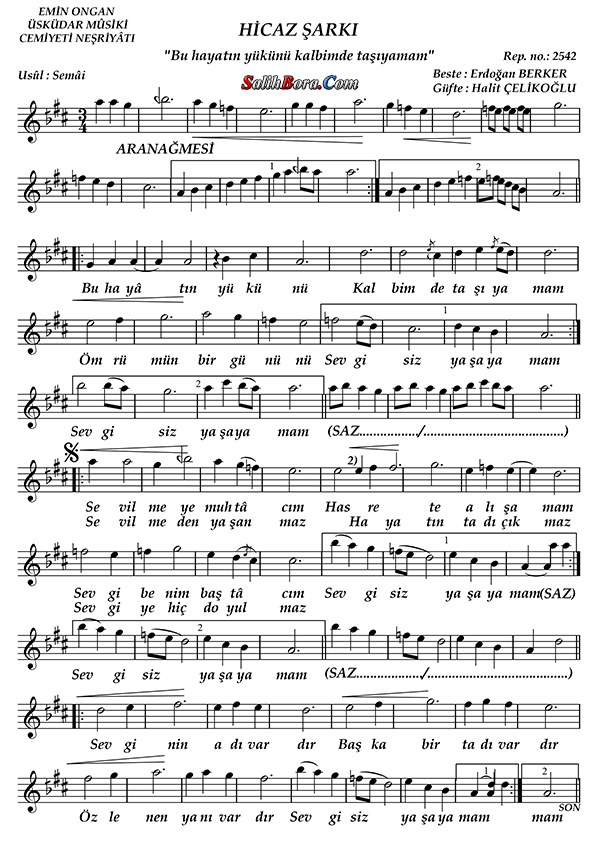 Bestesi Erdoğan Berker'e, güftesi Halit Çelikoğlu'na âit olan, hicâz makâmı, semâî usûlündeki şarkının; bütün bilgileri, sözleri, notaları ve video yorumları.