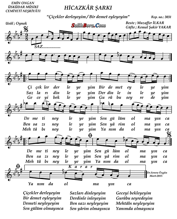 Bestesi Muzaffer İlkar'a, güftesi Kemâl Yakar'a âit olan, hicazkâr makâmı, aksak usûlündeki şarkının; bütün bilgileri, sözleri, notaları ve video yorumları.