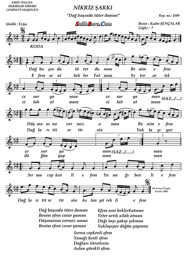 Bestesi Kadri Şençalar'a âit olan, nikrîz makâmı, evfer usûlündeki şarkının; bütün bilgileri, sözleri, notaları ve video yorumları.