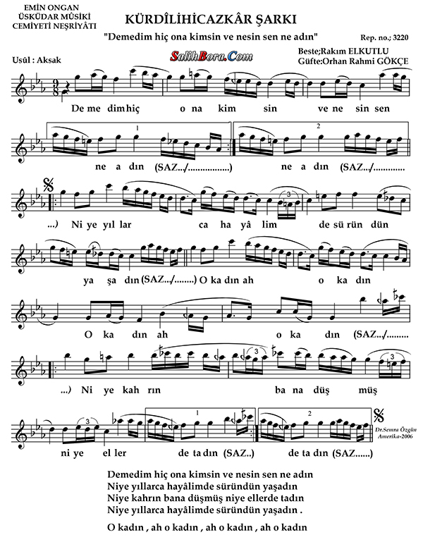 Bestesi Râkım Elkutlu'ya, güftesi Orhan Rahmi Gökçe'ye âit olan, kürdîli hicazkâr makâmı, aksak usûlündeki şarkının; ayrıntılı bilgileri, sözleri, notaları ve video yorumları.