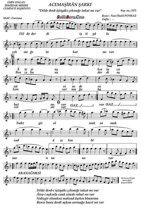Bestesi Nûri Halil Poyraz'a âit olan, acem aşîrân makâmı, curcuna usûlündeki şarkının; bütün bilgileri, sözleri, notaları ve video yorumları.