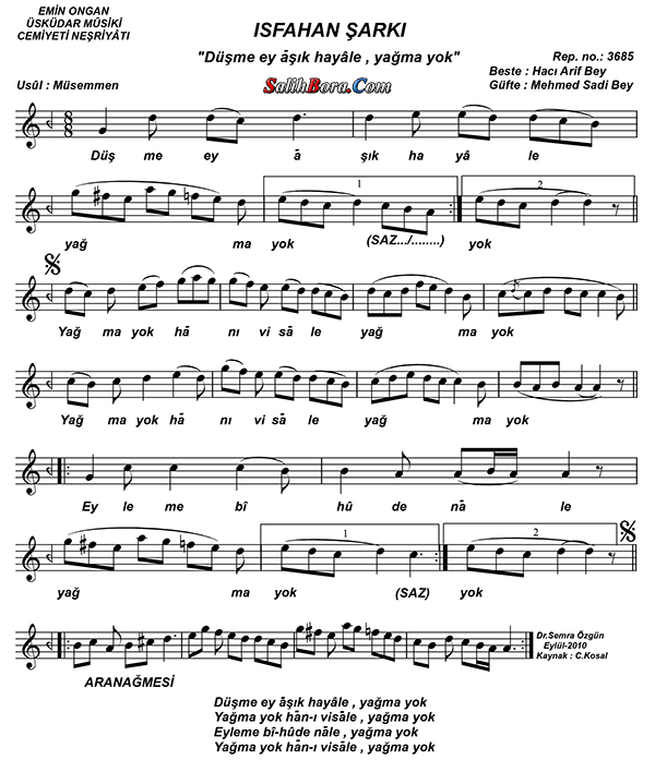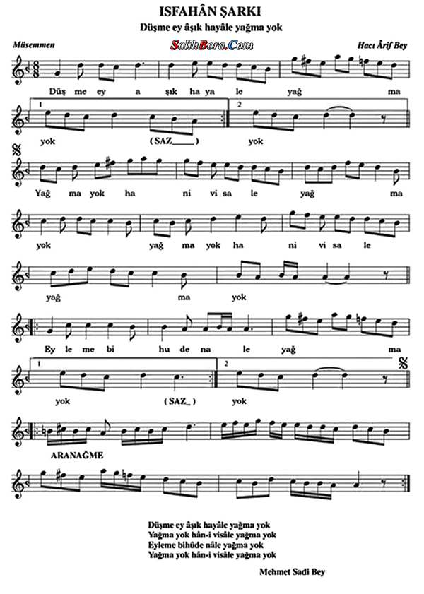 Bestesi Hacı Ârif Bey'e, güftesi Mehmet Sâdi Bey'e âit olan, isfahân makâmı, müsemmen usûlündeki şarkının; ayrıntılı bilgileri, sözleri, notaları ve video yorumları.