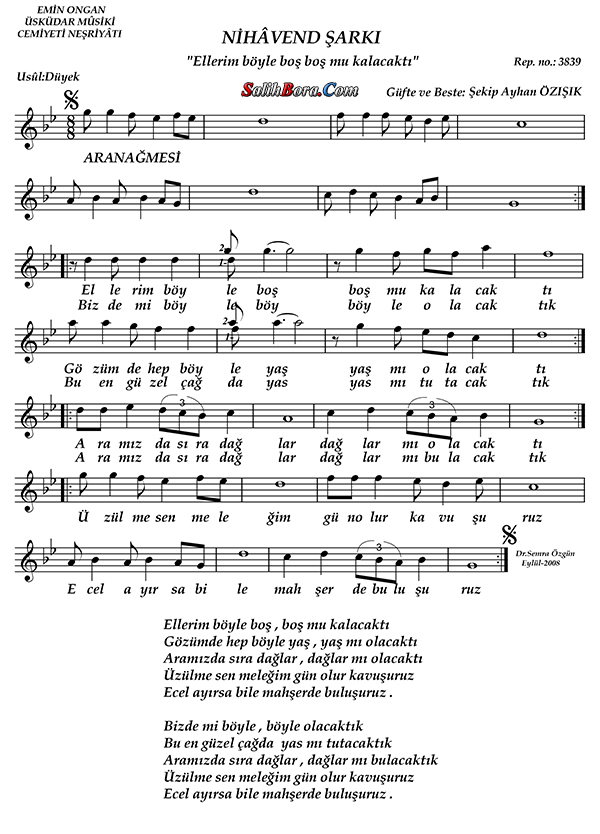 Bestesi ve güftesi Şekip Ayhan Özışık'a âit olan, nihâvend makâmı, düyek usûlündeki şarkının; ayrıntılı bilgileri, sözleri, notaları ve video yorumları.