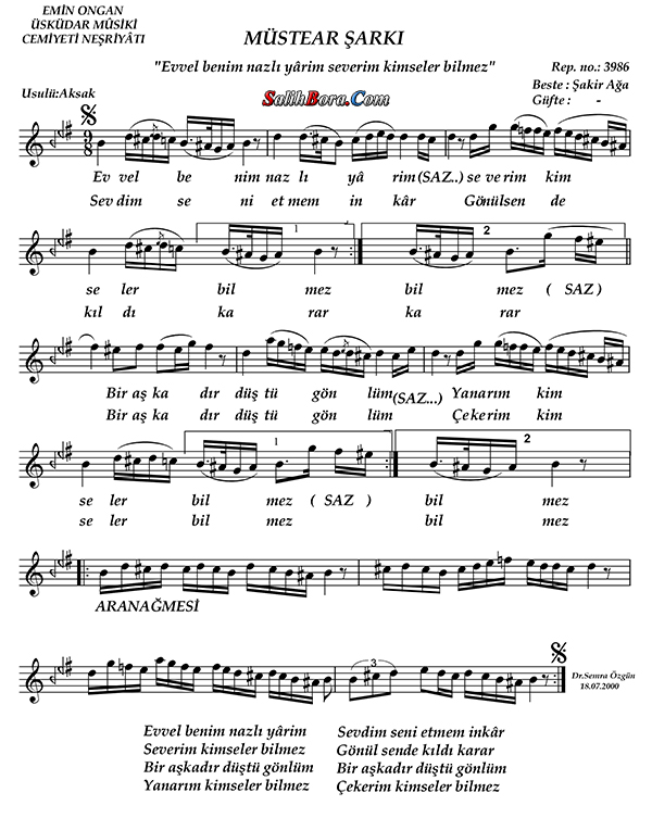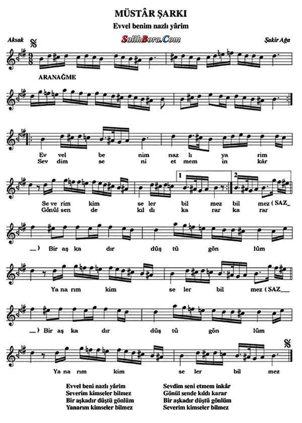 Bestesi Şâkir Ağa'ya âit olan, müstear makâmı, aksak usûlündeki şarkının; bütün bilgileri, sözleri, notaları ve video yorumları.