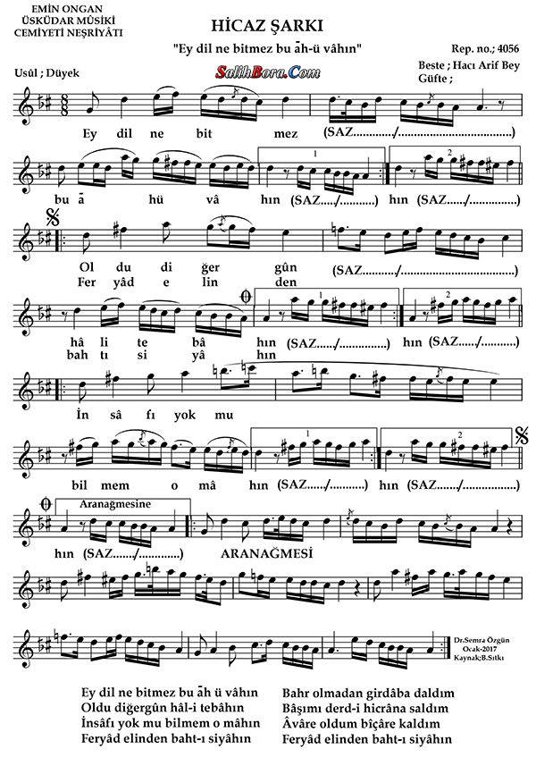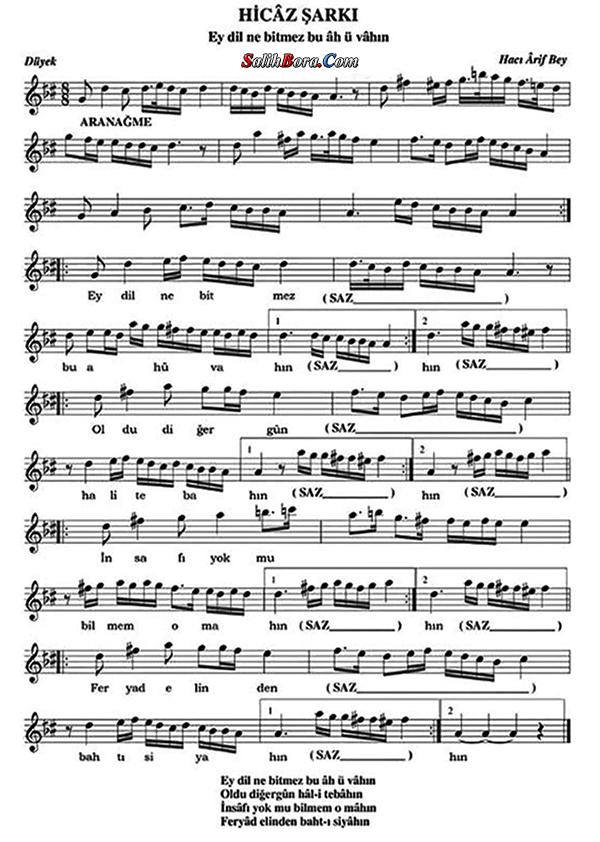 Bestesi Hacı Ârif Bey'e âit olan, hicâz makâmı, düyek usûlündeki şarkının; ayrıntılı bilgileri, sözleri, notaları ve video yorumları.