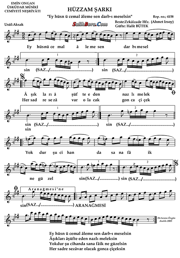 Ey hüsn-i cemâl âleme sen darb-ı meselsin notası - 1