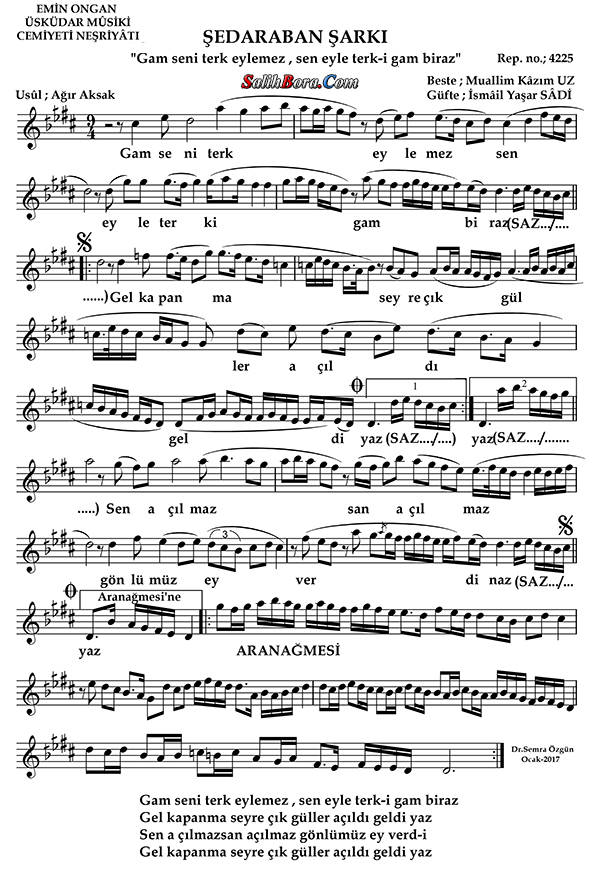Bestesi Kâzım Uz'a, güftesi İsmail Yaşar Şâdi'ye âit olan, şedd-i arabân makâmı, ağır aksak usûlündeki şarkının; ayrıntılı bilgileri, sözleri, notaları ve video yorumları.