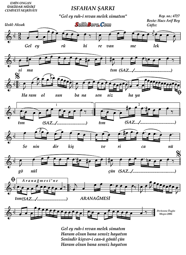 Bestesi Hacı Ârif Bey'e âit olan, isfahân makâmı, aksak usûlündeki şarkının; ayrıntılı bilgileri, sözleri, notaları ve video yorumları.
