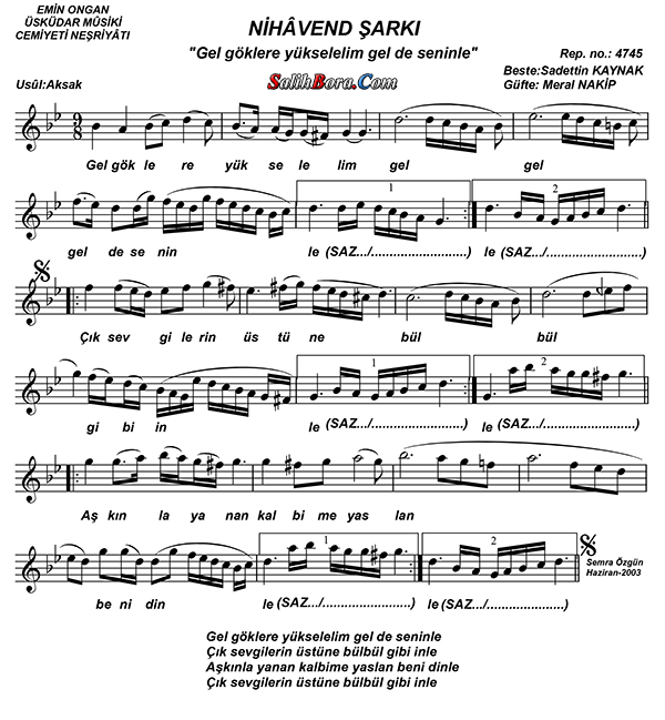 Bestesi Sâdettin Kaynak'a, güftesi Merâl Nakip'e âit olan, nihâvend makâmı, aksak usûlündeki şarkının; ayrıntılı bilgileri, sözleri, notaları ve video yorumları.