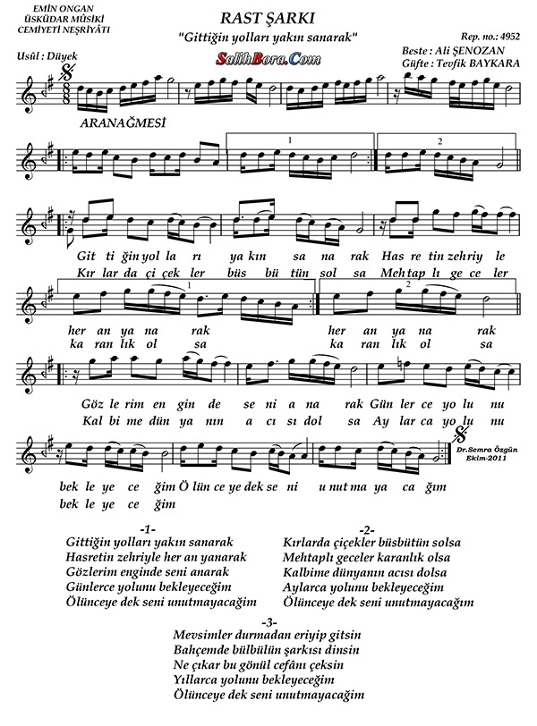 Bestesi Ali Şenozan'a, güftesi Tevfik Bayraktar'a âit olan, rast makâmı, düyek usûlündeki şarkının; bütün bilgileri, sözleri, notaları ve video yorumları.