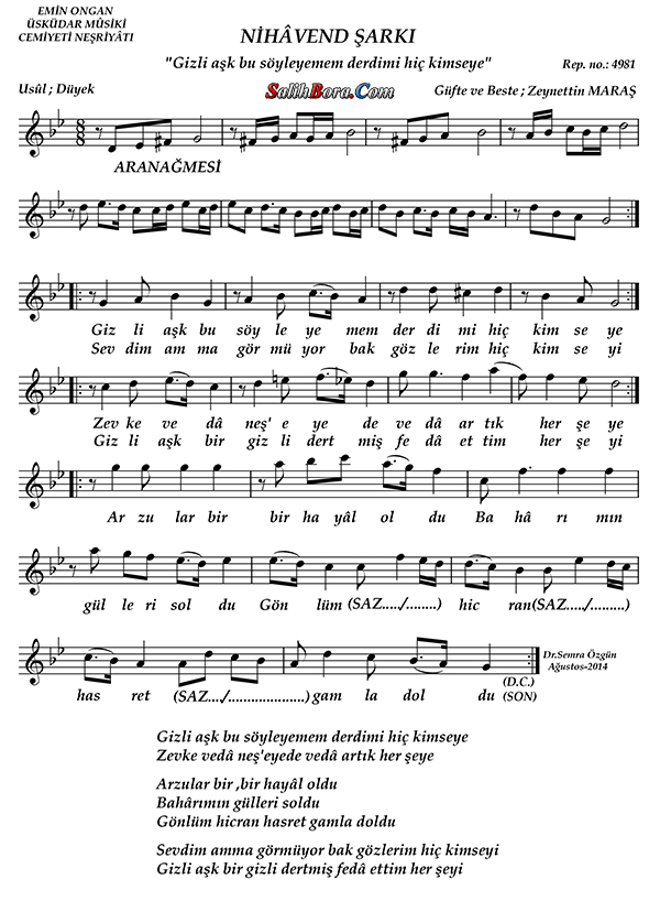 Bestesi ve güftesi Zeynettin Maraş'a âit olan, nihâvend makâmı, düyek usûlündeki şarkının; bütün bilgileri, sözleri, notaları ve video yorumları.