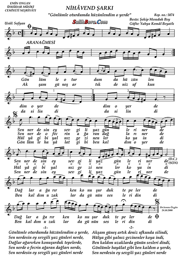 Bestesi Şekip Memduh Bey'e, güftesi Yahyâ Kemâl Beyatlı'ya âit olan, nihâvend makâmı, sofyan usûlündeki şarkının; ayrıntılı bilgileri, sözleri, notaları ve video yorumları.