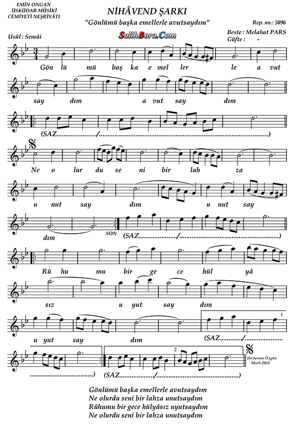Bestesi Melâhat Pars'a âit olan, nihâvend makâmı, semâî usûlündeki şarkının; ayrıntılı bilgileri, sözleri, notaları ve video yorumları.