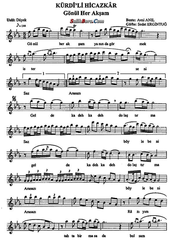 Bestesi Avni Anıl'a, güftesi Sedat Ergintuğ'a âit olan, kürdîli hicazkâr makâmı, düyek usûlündeki şarkının; bütün bilgileri, sözleri, notaları ve video yorumları.