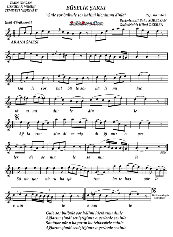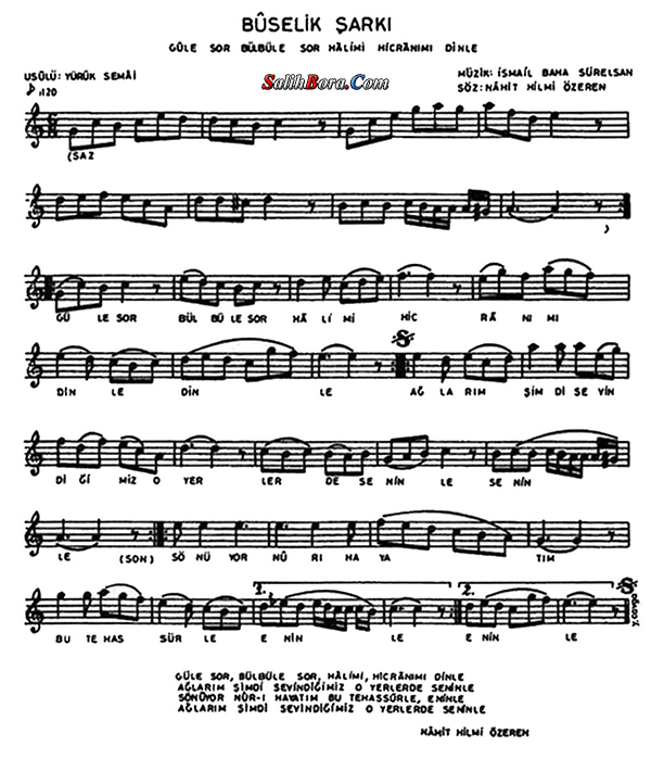 Bestesi İsmâil Bahâ Sürelsan'a, güftesi Nâhit Hilmi Özeren'e âit olan, bûselik makâmı, yürük semâî usûlündeki şarkının; bütün bilgileri, sözleri, notaları ve video yorumları.