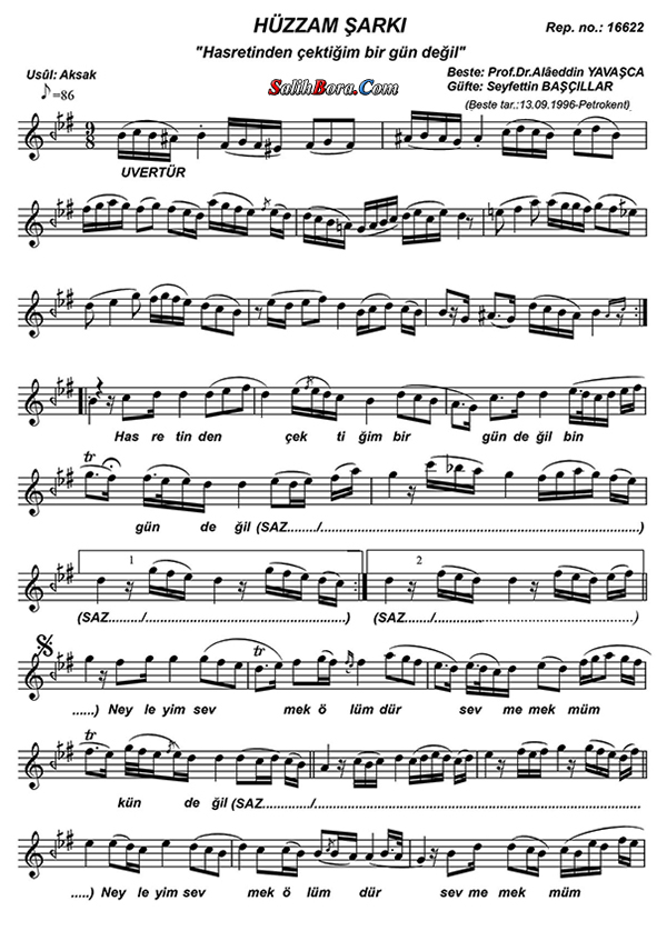 Bestesi ve güftesi Prof. Dr. Alâeddin Yavaşca'ya âit olan, hüzzâm makâmı, aksak usûlündeki şarkının; ayrıntılı bilgileri, sözleri, notaları ve video yorumları.