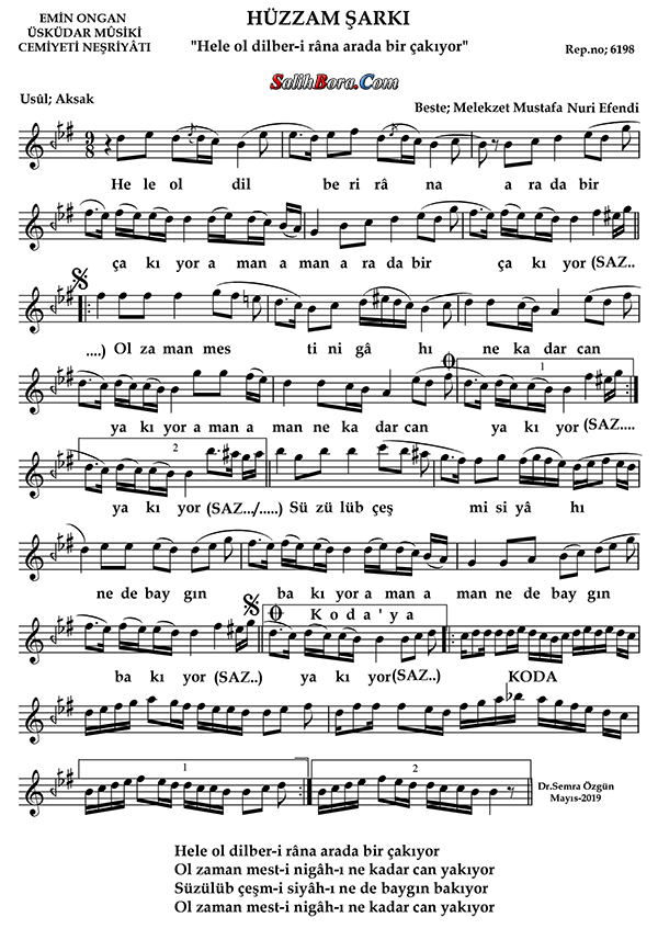 Bestesi Mustafa Nûri'ye (Melekzet Efendi) âit olan, hüzzâm makâmı, aksak usûlündeki şarkının; ayrıntılı bilgileri, sözleri, notaları ve video yorumları.