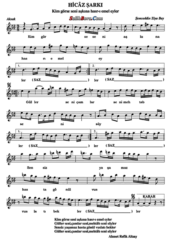 Bestesi Şemseddîn Ziyâ Bey'e, güftesi Ahmet Refik Altınay'a âit olan, hicâz makâmı, aksak usûlündeki şarkının; bütün bilgileri, sözleri, notaları ve video yorumları.