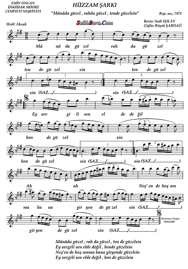 Bestesi Sâdi Işılay'a, güftesi Rüştü Şardağ'a âit olan, hüzzâm makâmı, aksak usûlündeki şarkının; bütün bilgileri, sözleri, notaları ve video yorumları.