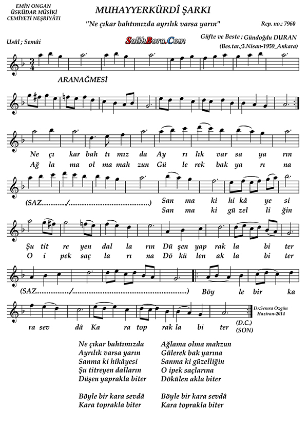 Bestesi ve güftesi Gündoğdu Duran'a âit olan, muhayyer kürdî makâmı, semâî usûlündeki şarkının; bütün bilgileri, sözleri, notaları ve video yorumları.