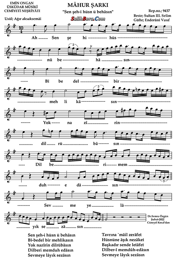 Bestesi Sultan 3. Selim'e, güftesi Enderûnî Vâsıf'a âit olan, mâhûr makâmı, ağır aksak semaî usûlündeki şarkının; bütün bilgileri, sözleri, notaları ve video yorumları.