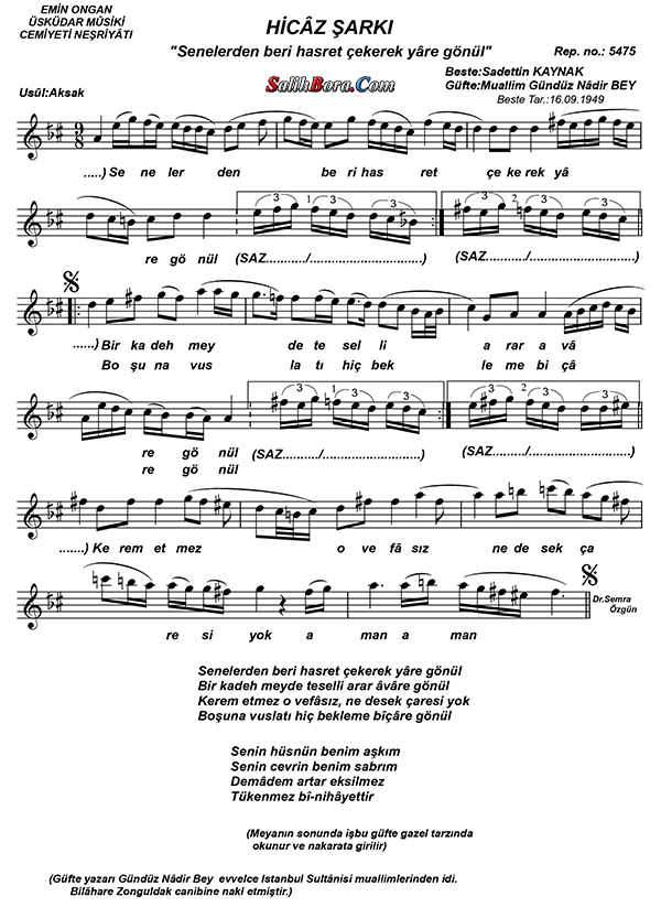 Bestesi Sâdettin Kaynak'a, güftesi Gündüz Nadir'e âit olan, hicâz makâmı, aksak usûlündeki şarkının; ayrıntılı bilgileri, sözleri, notaları ve video yorumları.