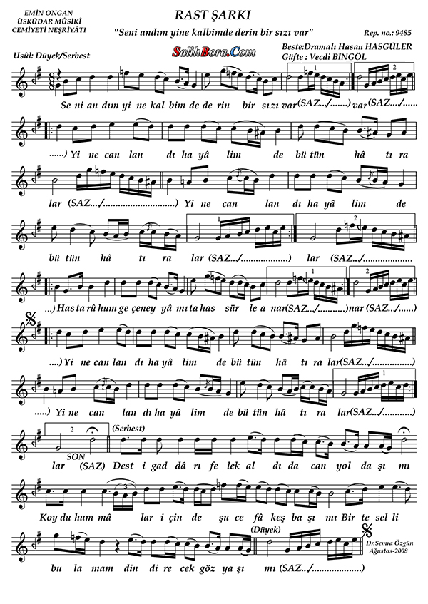 Bestesi Dramalı Hasan Hasgüler'e âit olan, rast makâmı, düyek usûlündeki şarkının; bütün bilgileri, sözleri, notaları ve video yorumları.