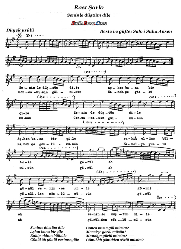 Bestesi ve güftesi Sabri Süha Ansen'e âit olan, rast makâmı, düyek usûlündeki şarkının; ayrıntılı bilgileri, sözleri, notaları ve video yorumları.