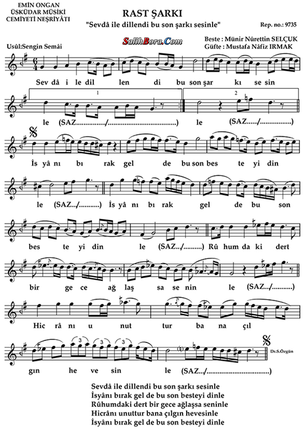 Bestesi Münir Nurettin Selçuk'a, güftesi Mustafa Nâfiz Irmak'a âit olan, rast makâmı, sengin semâî usûlündeki şarkının; bütün bilgileri, sözleri, notaları ve video yorumları.