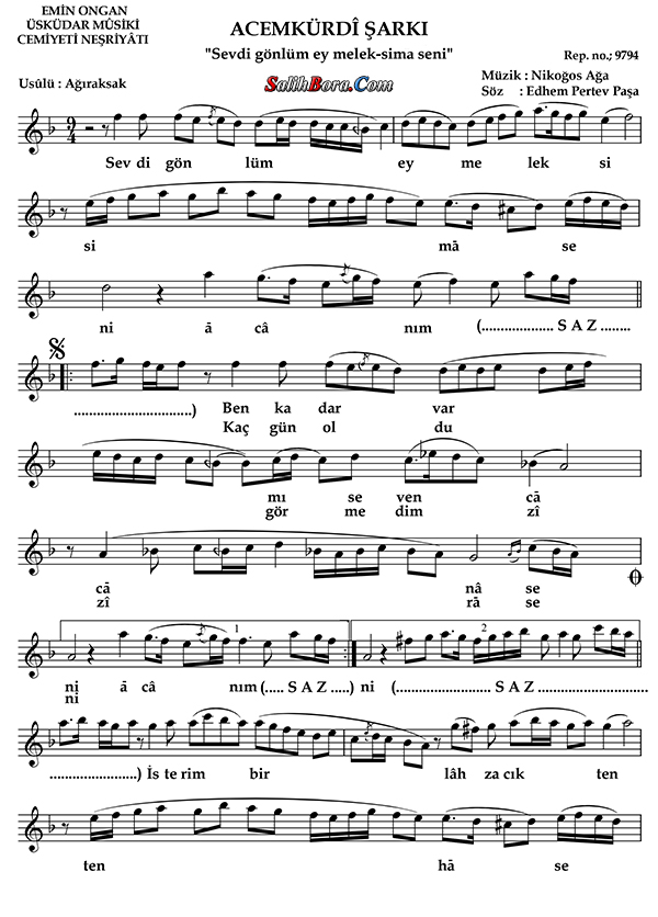 Bestesi Nikoğos Ağa'ya, güftesi Ethem Pertev Paşa'ya âit olan, acem kürdî makâmı, ağır aksak usûlündeki şarkının; bütün bilgileri, sözleri, notaları ve video yorumları.