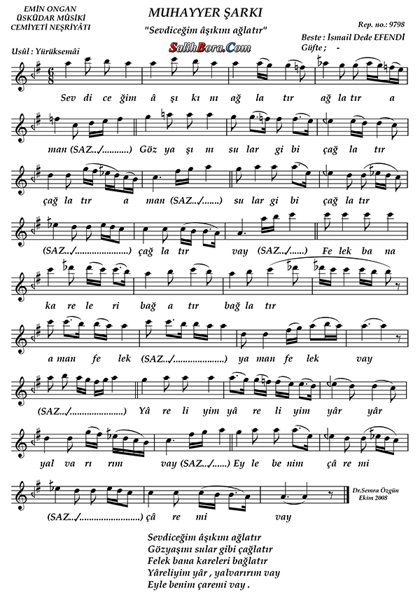 Bestesi Hammâmîzâde İsmail Dede Efendi'ye âit olan, muhayyer makâmı, yürük semâî usûlündeki şarkının; bütün bilgileri, sözleri, notaları ve video yorumları.
