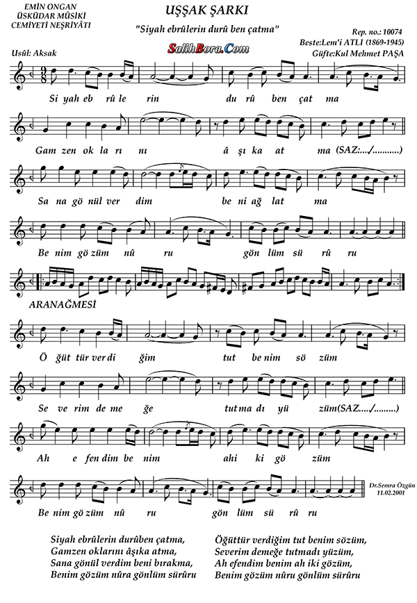 Bestesi Lemî Atlı'ya, güftesi Kul Mehmet'e âit olan, uşşak makâmı, aksak usûlündeki şarkının; bütün bilgileri, sözleri, notaları ve video yorumları.