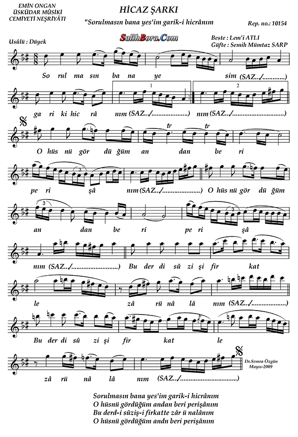 Bestesi Lemî Atlı'ya, güftesi Semih Mümtaz'a âit olan, hicâz makâmı, düyek usûlündeki şarkının; bütün bilgileri, sözleri, notaları ve video yorumları.