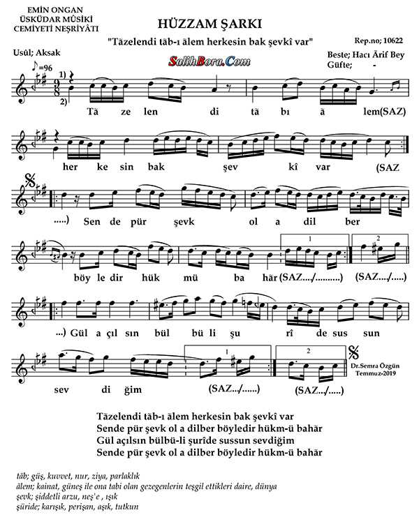 Bestesi Hacı Ârif Bey'e âit olan, hüzzâm makâmı, aksak usûlündeki şarkının; ayrıntılı bilgileri, sözleri, notaları ve video yorumları.