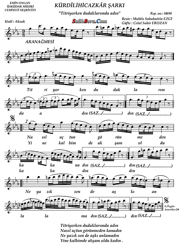 Bestesi Muhlis Sabahattin Ezgi'ye, güftesi Celâl Sâhir Erozan'a âit olan, kürdîli hicazkâr makâmı, aksak usûlündeki şarkının; bütün bilgileri, sözleri, notaları ve video yorumları.