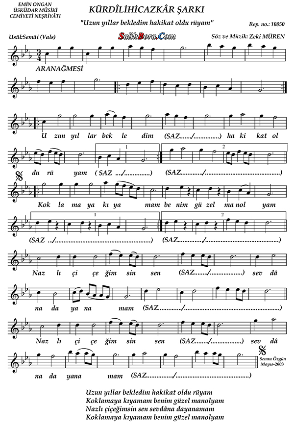 Uzun yıllar bekledim hakîkat oldu rüyâm notası - 2