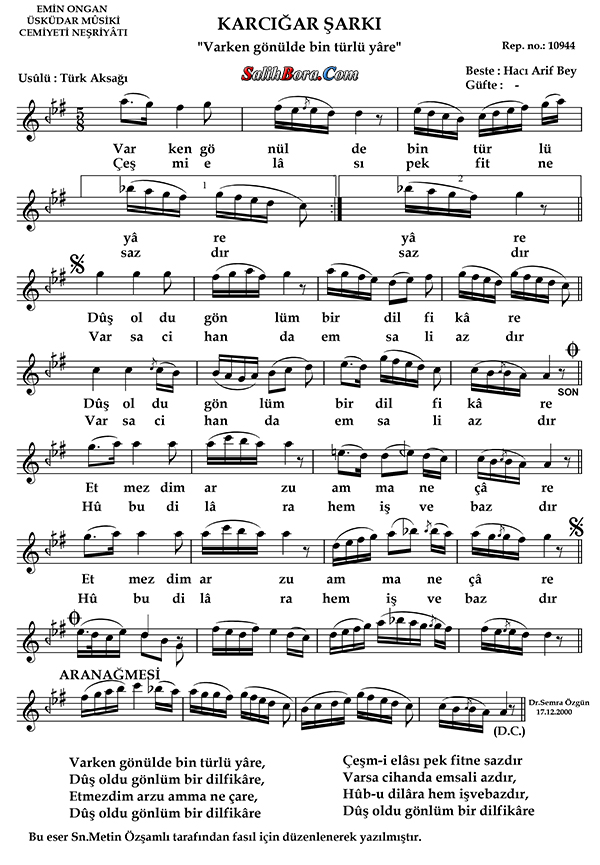 Bestesi Hacı Ârif Bey'e âit olan, karcığar makâmı, türk aksağı usûlündeki şarkının; ayrıntılı bilgileri, sözleri, notaları ve video yorumları.