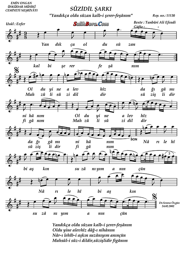 Bestesi Tanbûrî Ali Efendi'ye âit olan, sûzidil makâmı, evfer usûlündeki şarkının; ayrıntılı bilgileri, sözleri, notaları ve video yorumları.