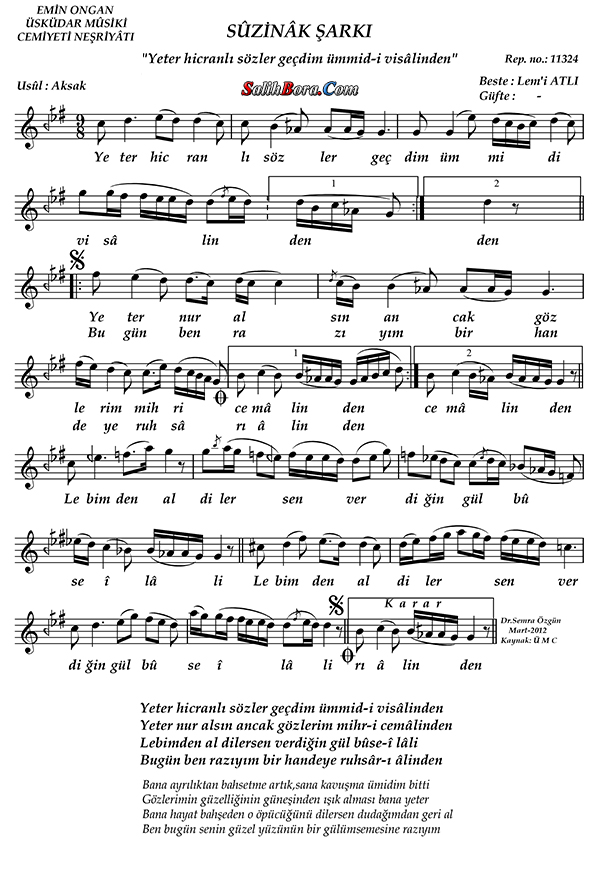 Bestesi Lemî Atlı'ya âit olan, sûzinâk makâmı, aksak usûlündeki şarkının; bütün bilgileri, sözleri, notaları ve video yorumları.