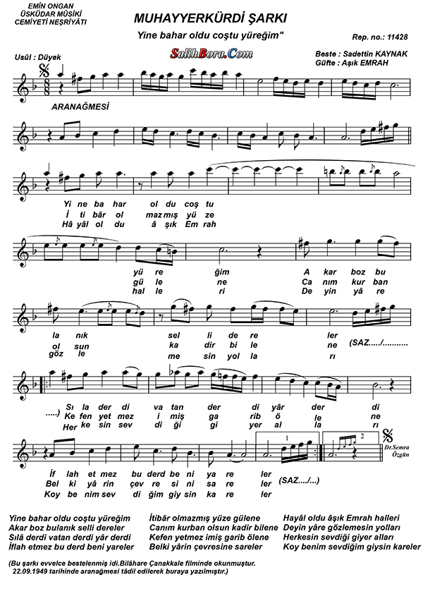 Bestesi Sâdettin Kaynak'a, güftesi Emrah'a âit olan, muhayyer kürdî makâmı, düyek usûlündeki şarkının; ayrıntılı bilgileri, sözleri, notaları ve video yorumları.